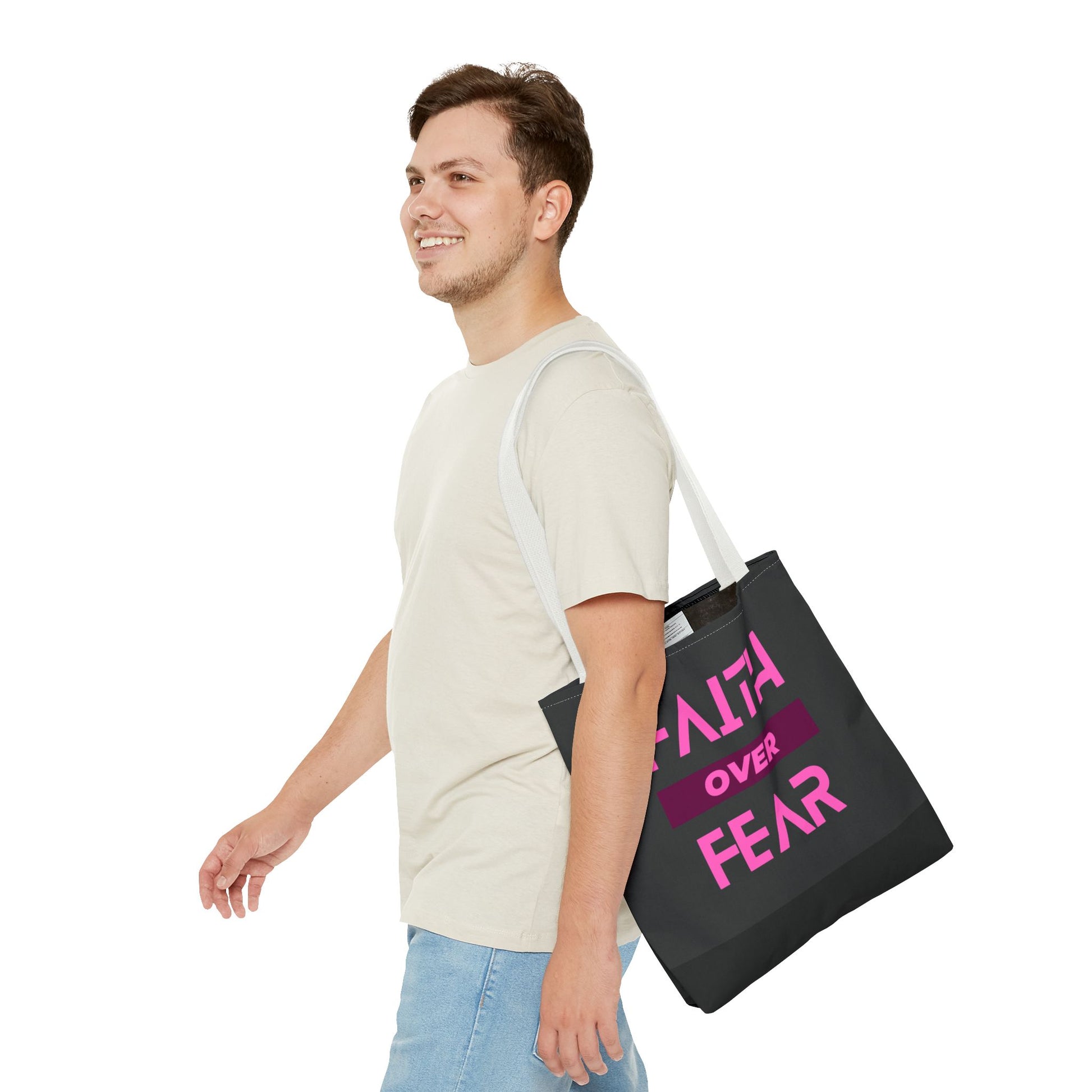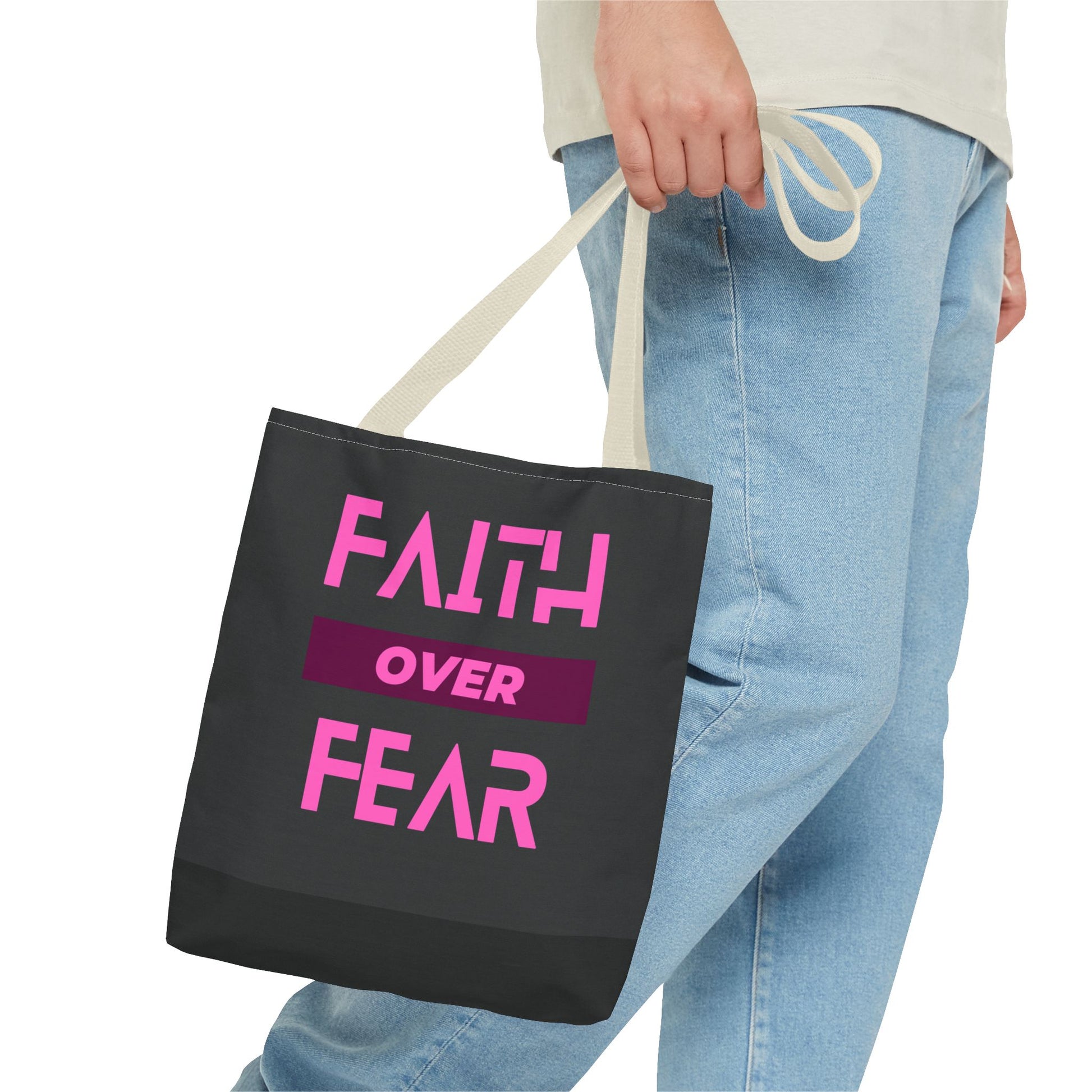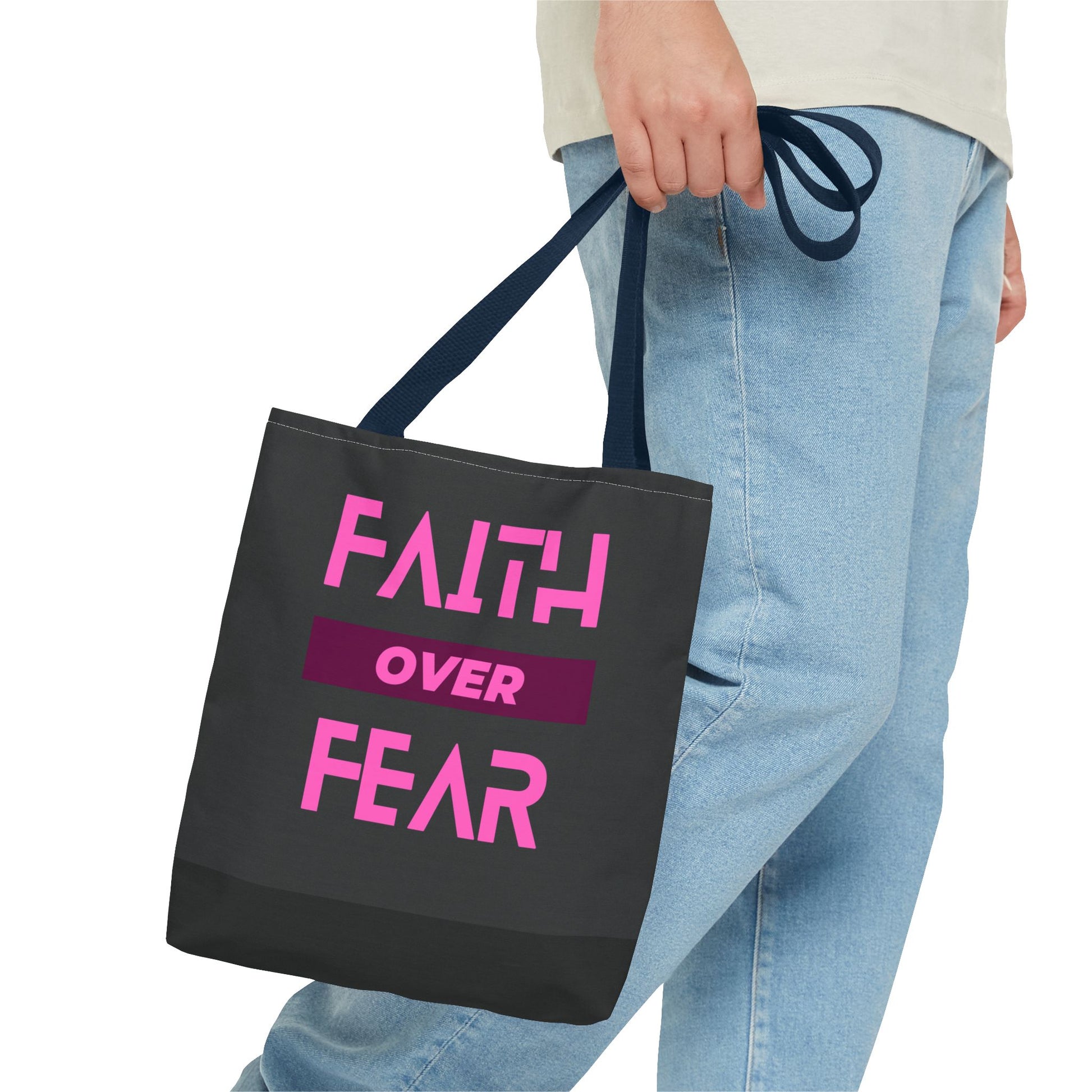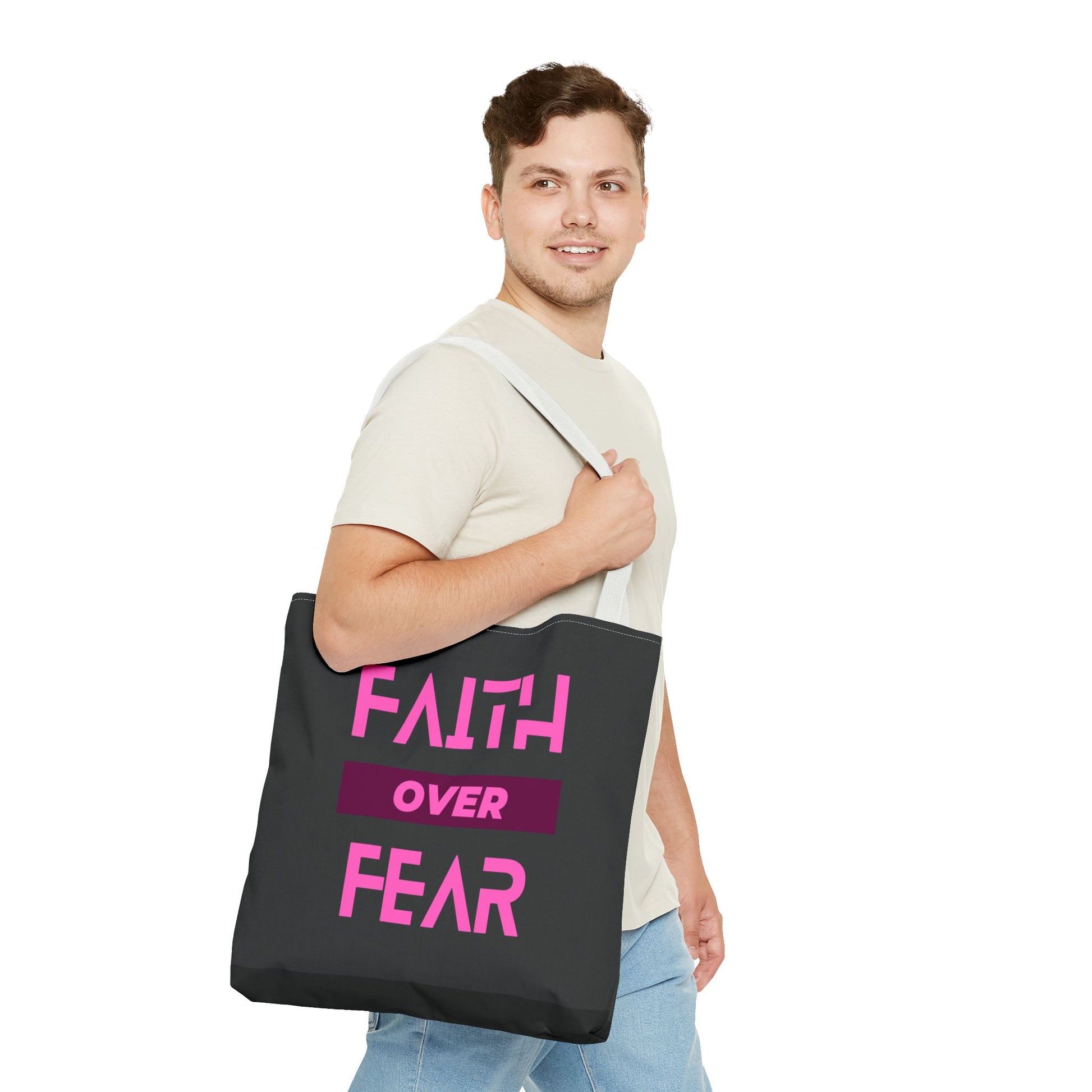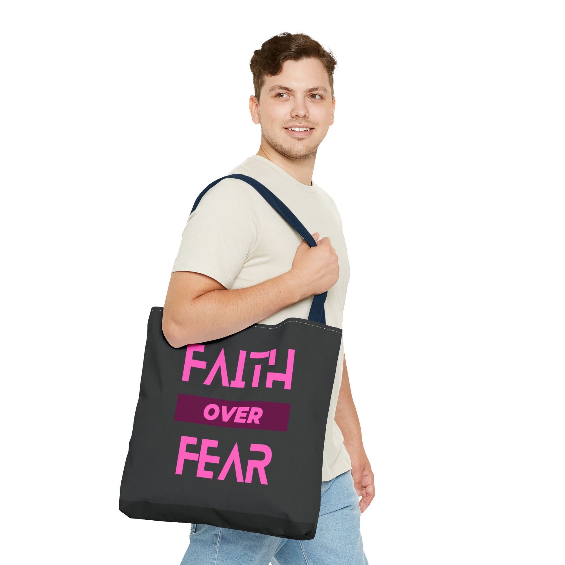 This Faith over Fear Tote Bag exudes positivity and strength, perfect for carrying essentials while spreading a message of hope. Ideal for those who prioritize faith in their daily lives or need a reminder to overcome fears. Relevant for religious holidays, inspirational occasions, or as a thoughtful gift for a loved one.