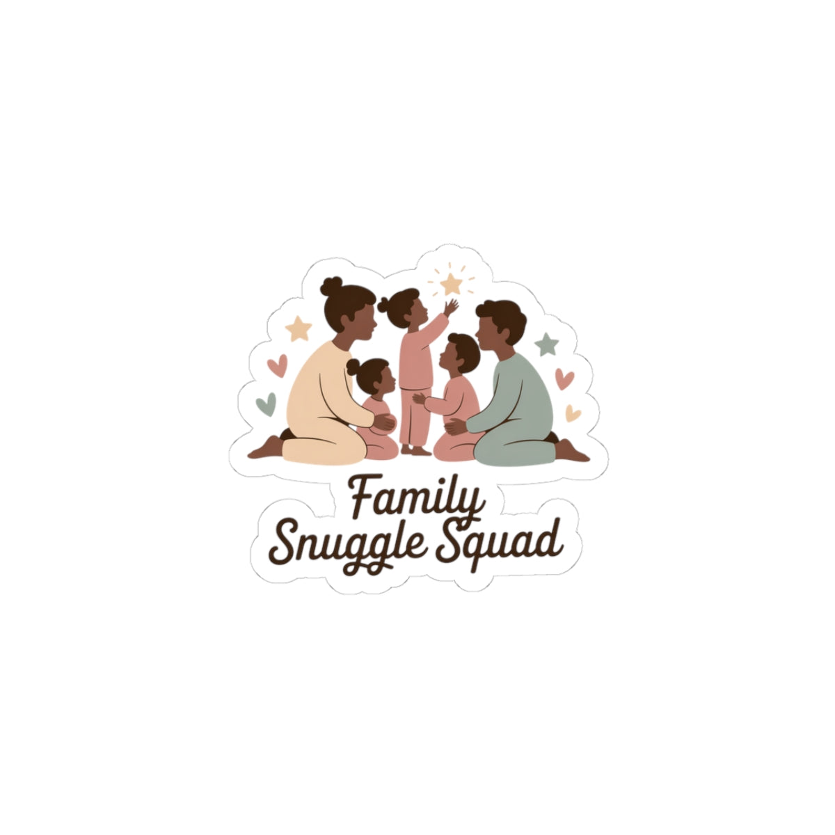 A warm, minimalist family illustration celebrating togetherness in soft neutral tones—parents and children gathered in cozy PJs with the phrase “Family Snuggle Squad.” The design echoes the coordinated family sets & pajamas trend by offering a clear, photo-friendly motif and bold, legible lettering that works across matching outfits and holiday photo themes. Subtle stars and hearts add a playful, memory-making vibe while keeping the artwork versatile for seasonal or everyday family coordination.