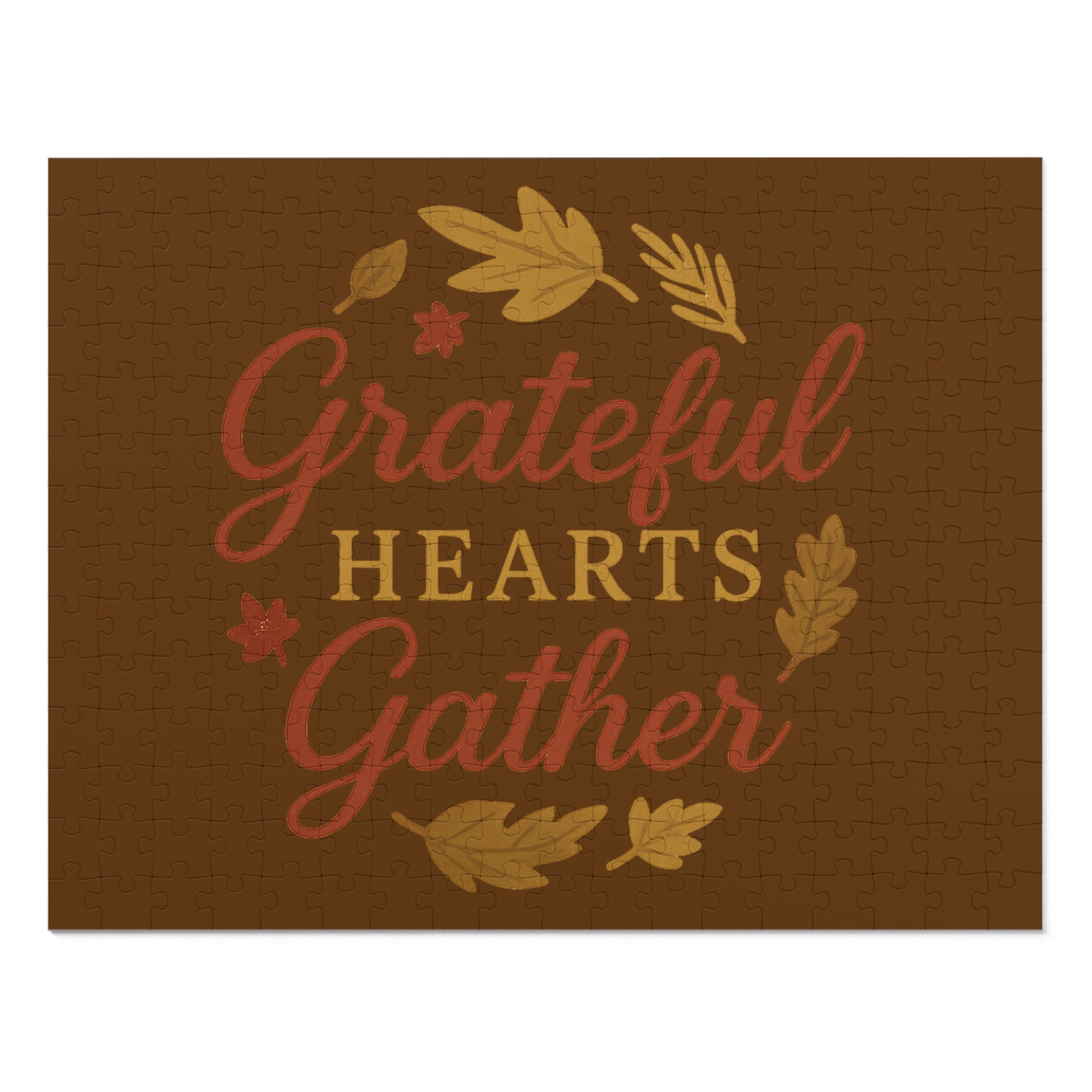 Grateful Hearts Gather Jigsaw Puzzle — Thanksgiving Fall Leaves Puzzle with Tin