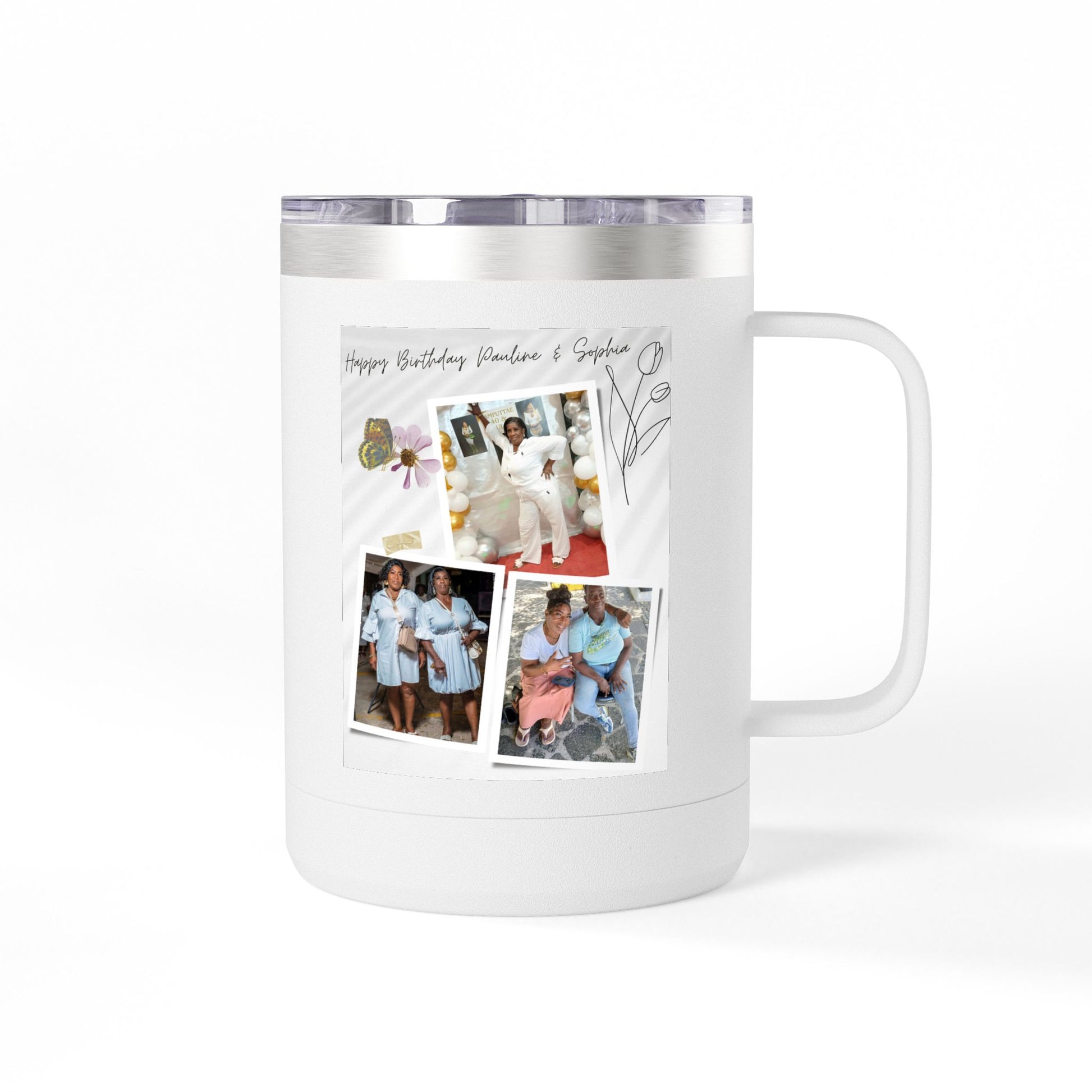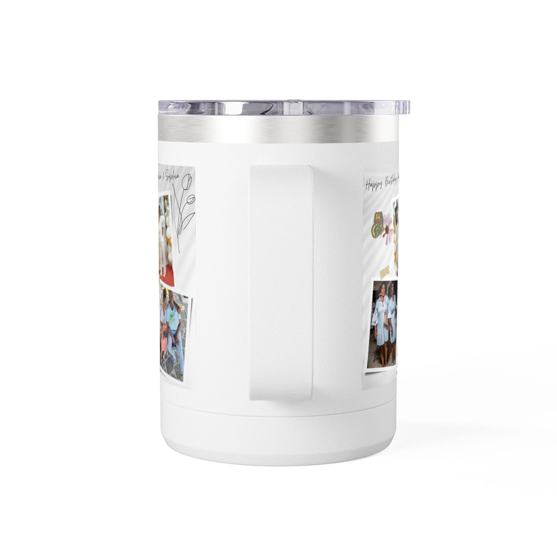 Insulated Coffee Tumbler with Custom Photos. Double-wall design keeps drinks hot/cold for hours. Perfect personalized birthday gift with leak-proof lid.