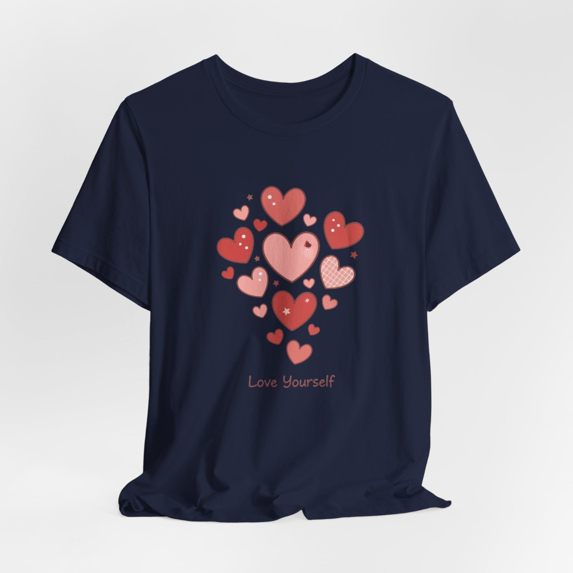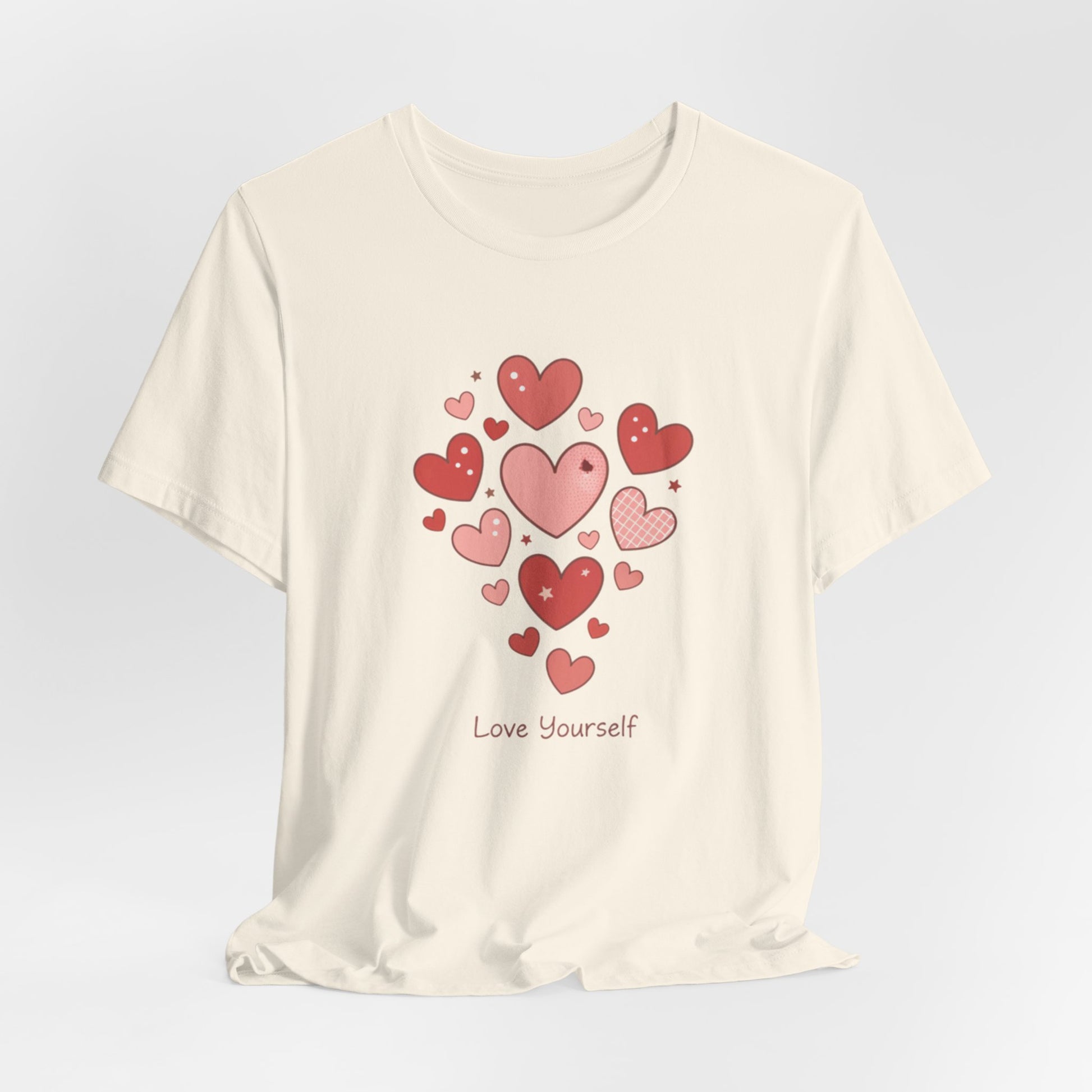 Soft, minimal tee featuring a cluster of tiny red and pink heart doodles arranged like a casual confetti bouquet on the chest. The small, approachable heart motif reads as friendly and lighthearted—a subtle nod to the Tiny Hearts Everywhere trend that layers Valentine cues onto everyday basics. Breathable cotton and a neat crew neckline make it easy to wear alone or under a jacket for everyday moments of low-key sweetness.